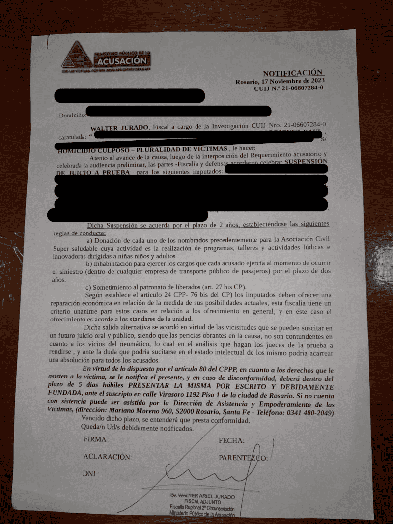 Este jueves, el juez Pablo Pinto aceptó el acuerdo entre el fiscal Walter Jurado y las defensas de los diez imputados por el siniestro vial para avanzar en una suspensión del juicio a prueba. En concreto, los acusados deberán donar dinero a una ONG, pagarles en cuotas una suma a los damnificados y no ejercer cargos relacionados en empresas de transporte por dos años.