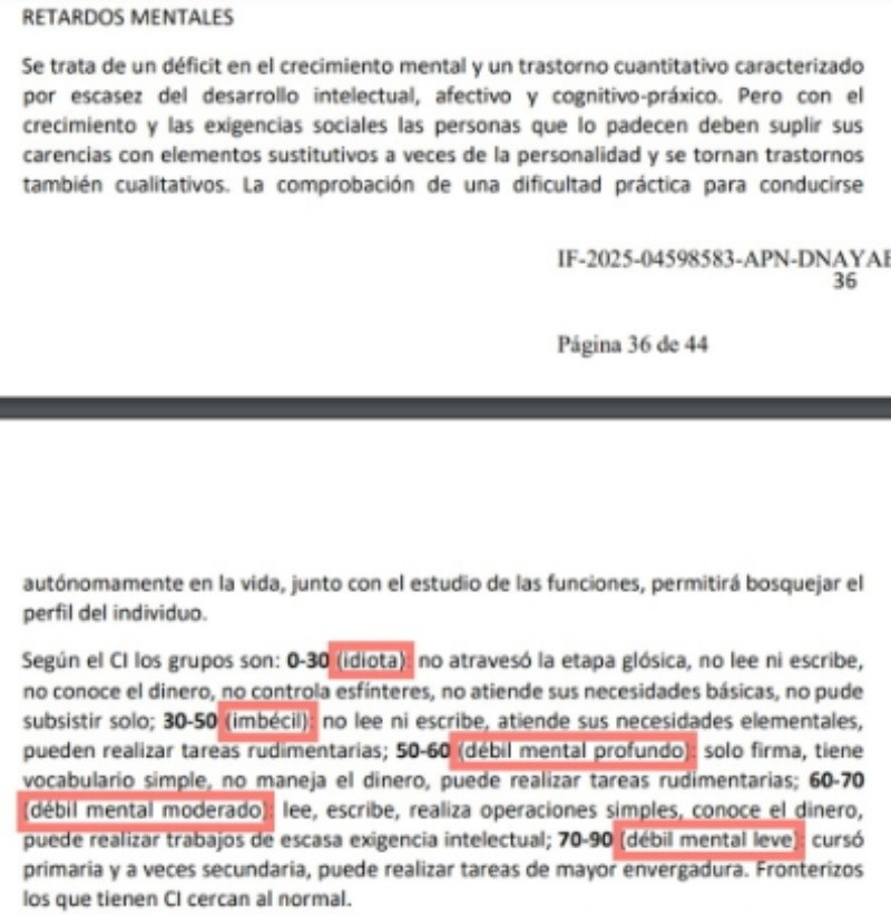"Dicha normativa incluyó un anexo con términos que, históricamente, se han utilizado en la medicina psiquiátrica para describir grados profundos de déficit intelectual, pero que, en la actualidad, han sido discontinuados", sumaron.