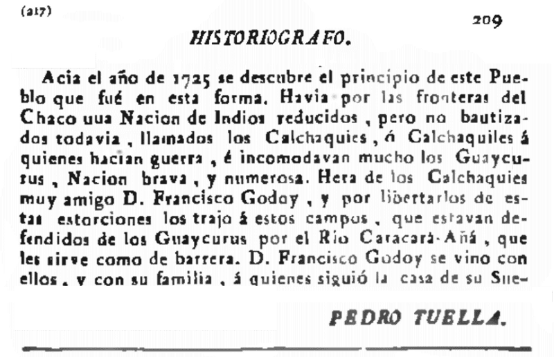 Después, mucho después, en 1925, un concejal (Calixto Lassaga) comprende las virtudes políticas, y sobre todo económicas, de ostentar un aniversario con número redondo y potente. Una excusa para festejar y pedir obras a Nación y a Provincia. Buscará hacia atrás y encontrará un texto del cronista y funcionario español Pedro Tuella publicado en 1802. El escrito habla de un tal Francisco de Godoy que en 1725 creó o inició el pueblo junto a su familia y un grupo de indígenas Calchaquíes.