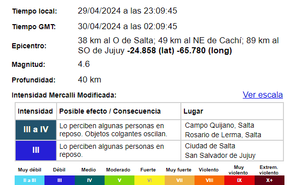 De acuerdo también con los datos proporcionados por el Inpres, en la zona de Campo Quijano-Rosario de Lerma, la intensidad del sismo osciló entre tres y cuatro en la escala correspondiente y este rango implica la percepción del movimiento por parte de algunas personas en reposo, así como el oscilar de objetos colgantes.