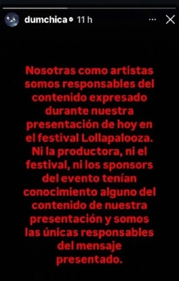 Al conocer la controversia virtual, desde la banda se emitió un comunicado en su cuenta de Instagram en el que aclaró que "ni la productora, ni el festival, ni los sponsors del evento tenían conocimiento alguno del contenido" y que la banda es "la única responsable del mensaje presentado". La declaración buscó desmarcar a los organizadores del festival de cualquier vínculo con la proyección, subrayando la independencia de la banda en la decisión de realizar dicha proyección.