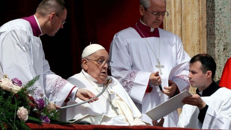 Durante la bendición, el pontífice argentino permaneció sentado en la silla de ruedas, no llevaba las cánulas nasales para el oxígeno, deseó una "Buena Pascua" y pidió al maestro de ceremonias, Diego Ravelli, que leyese el mensaje de la Pascua.