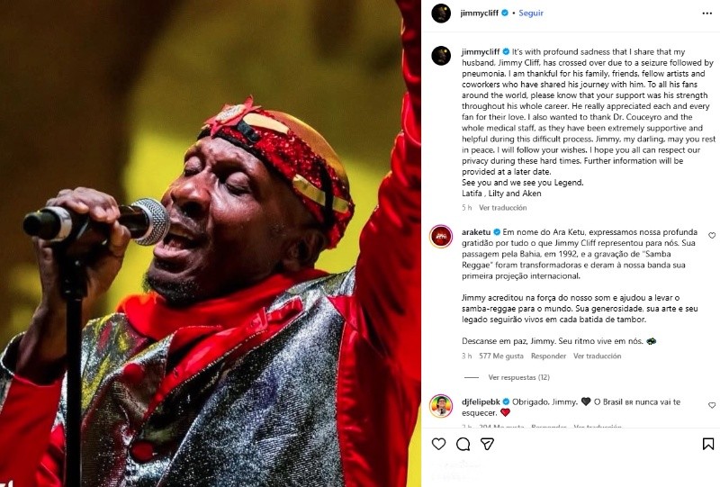 "Con profunda tristeza les comparto que mi esposo, Jimmy Cliff, falleció debido a una convulsión a consecuencia de una neumonía", escribió Chambers en redes sociales. "A todos sus fans de todo el mundo, sepan que su apoyo fue su fortaleza durante toda su carrera. Él agradeció de verdad el cariño de cada uno de ellos", agregó.