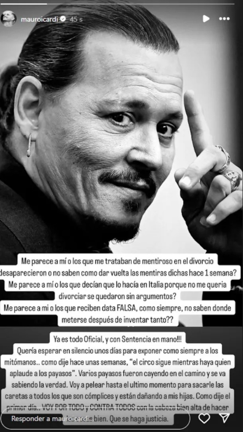 Acompañando sus palabras con una imagen de Johnny Depp en pleno juicio contra Amber Heard, una referencia que ha utilizado en varias oportunidades, cerró su descargo con una advertencia: “Voy a pelear hasta el último momento para sacarle las caretas a todos los que son cómplices y están dañando a mis hijas. Como dije el primer día… VOY POR TODO y CONTRA TODOS, con la cabeza bien alta de hacer las cosas bien. Que se haga justicia”