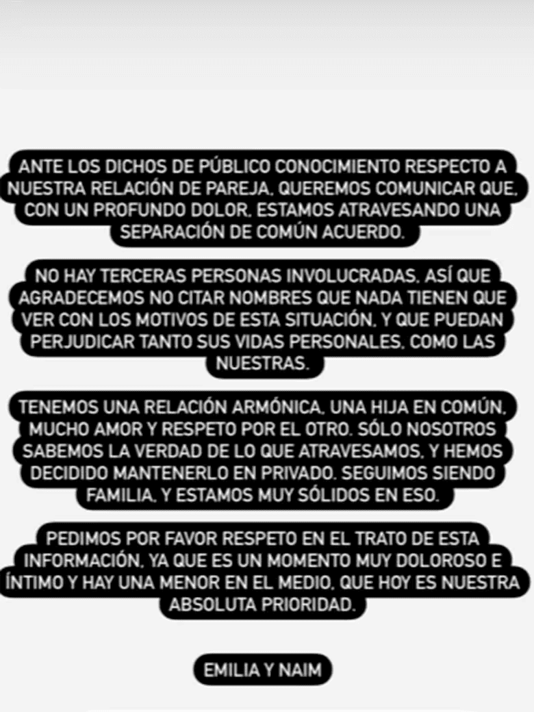 A modo de cierre, sumaron: "Pedimos por favor respeto en el trato de esta información, ya que es un momento muy doloroso e íntimo, y hay una menor en el medio que hoy es nuestra absoluta prioridad. Emilia y Naim".