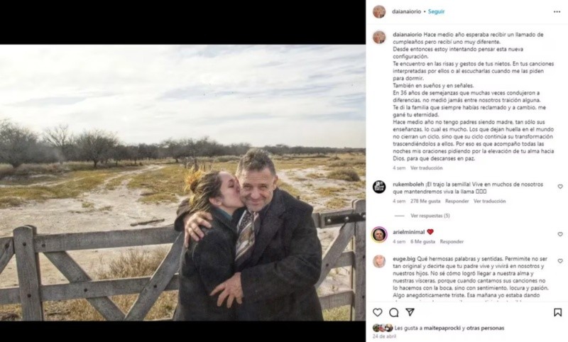Lo cierto es que no es la primera vez que la joven hace uso de sus redes para recordar al músico. Semanas atrás, cuando se cumplieron seis meses de la muerte de su papá, escribió en un sentido posteo: "Hace medio año esperaba recibir un llamado de cumpleaños, pero recibí uno muy diferente. Desde entonces estoy intentando pensar esta nueva configuración. Te encuentro en las risas y gestos de tus nietos".