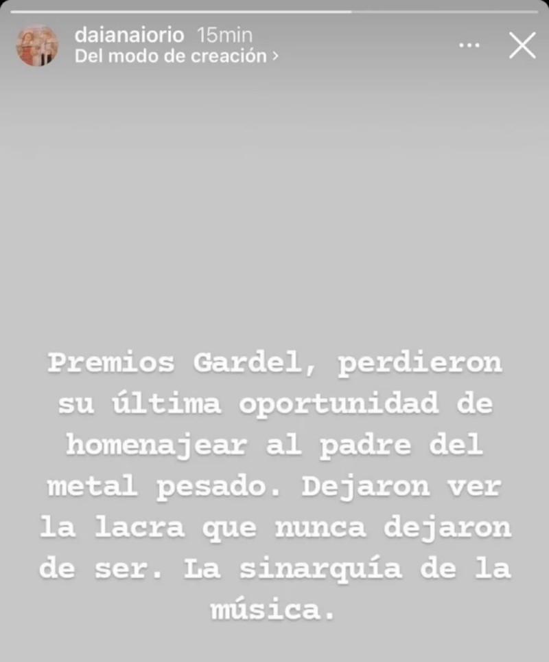En un posteo que compartió en sus redes sociales, la joven expuso: "Premios Gardel, perdieron su última oportunidad de homenajear al padre del metal pesado".