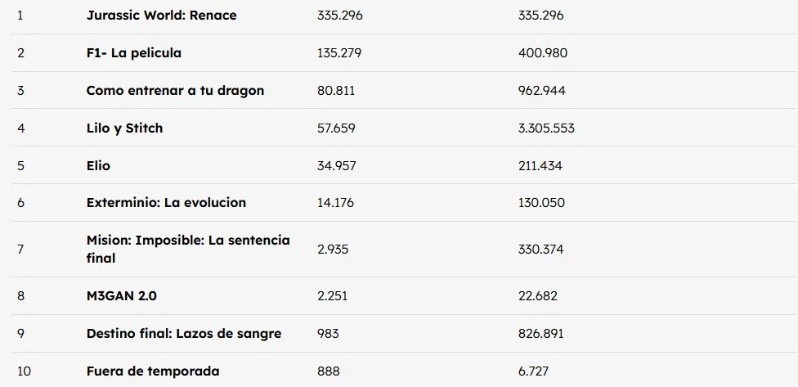 Sin otros estrenos en el top ten, Lilo y Stitch –la película más taquillera de 2025, con 3.307.257 entradas vendidas–, quedó en la cuarta posición (57.659 tickets), seguida de Elio (34.957).
