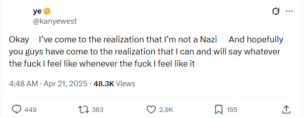 “Bueno [...] Me he dado cuenta de que no soy nazi [...] Y espero que ustedes también se hayan dado cuenta de que puedo decir lo que me dé la gana, y lo haré, cuando me dé la gana”, escribió el lunes en una publicación que ya no está disponible.