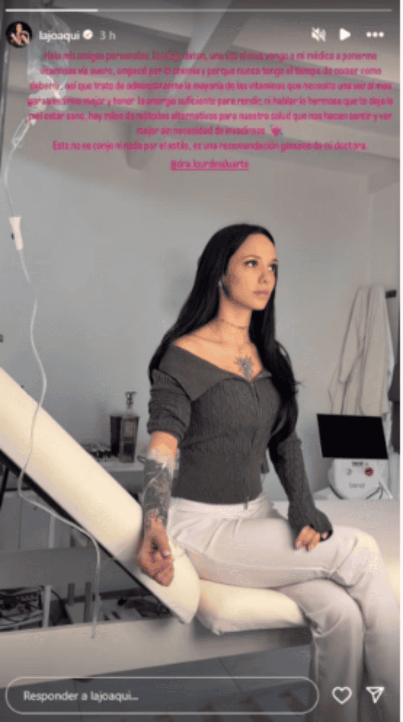 Más tarde, la cantante explicó: "Hola mis amigas personales, les dejo un dato. Una vez al mes vengo a mi médica a ponerme vitaminas vía suero".