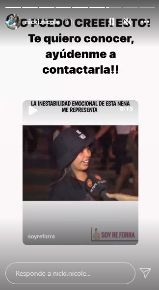 En el tuit, la cronista arrobó a Nicki Nicole con la frase “sueña conocer a @naikinai19”. En respuesta, la trapera rosarina compartió una historia en las últimas horas en la que pide “ayuda” para dar con la niña.