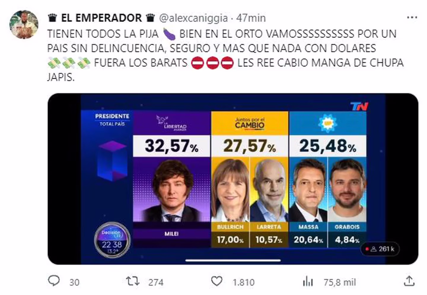 “Yo quiero ser respetuosa y respetar el voto de cada ciudadano, pero cómo vas a votar a Milei la conch... de la lora”, escribió la actriz Dalia Gutman en su cuenta de Twitter. En la misma línea, Lali Espósito tuiteó: “Qué peligroso. Qué triste”.