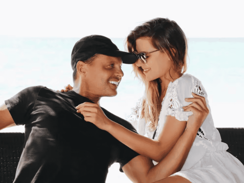 Al cantante mexicano se lo ve con una gran sonrisa en el rostro y una copa de vino en la mano mientras abraza a Michelle sentada arriba suyo.