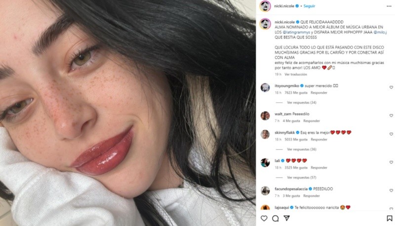 "¡Qué felicidad! Alma nominado a Mejor álbum de música urbana en los Latin Grammy y Dispara Mejor hip hop. Milo J qué bestia sos. Qué locura todo lo que está pasando con este disco", se lee en el posteo.