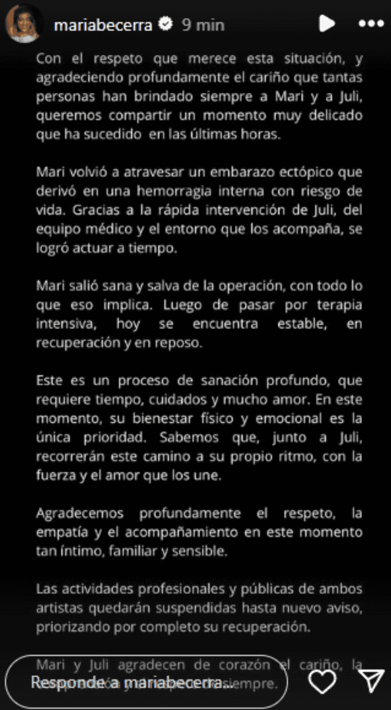 Luego explican que "Mari volvió a atravesar un embarazo ectópico que derivó en hemorragia interna con riesgo de vida". Y aclararon que hoy la artista está a salvo "gracias al rápida intervención de Juli, del equipo médico y el entorno que los acompaña".