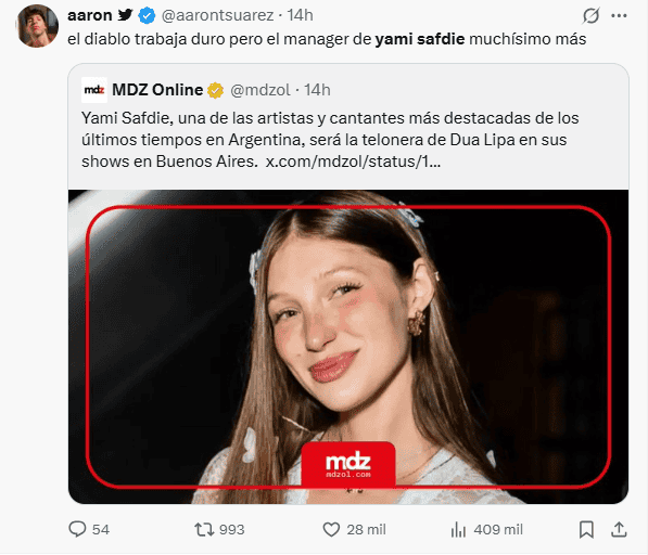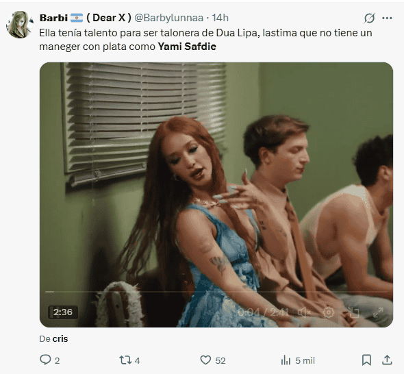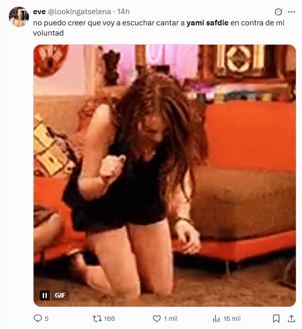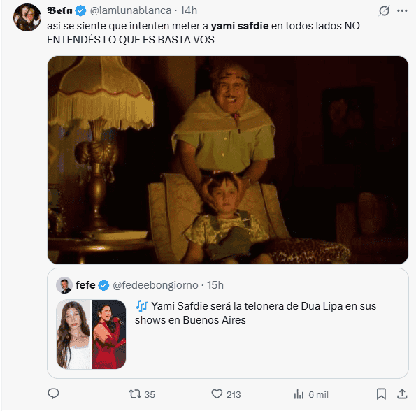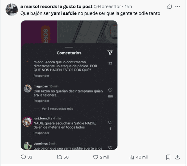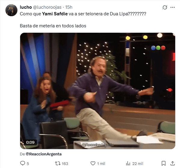 El anuncio de la presentación de la artista de oriunda de Haedo, parece haber generado más enojo que apoyos en X, ya sea porque preferían a otra artista en su lugar o porque no les gusta su música. Algunos de los comentarios que recibió Yami Safdie en X son: "Basta de meterla en todos lados", "no puedo creer que voy a escuchar cantar a yami safdie en contra de mi voluntad", "el esfuerzo de la industria por instalar a Yami Safdie en el mainstream suma un nuevo capítulo con Dua Lipa".