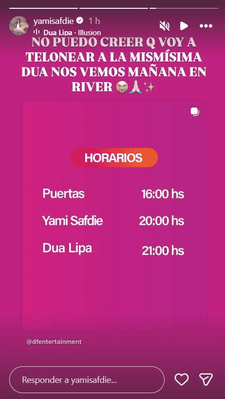 La propia Yami Safdie compartió la noticia este jueves en su cuenta oficial de Instagram muy emocionada: "No puedo creer que voy a telonear a la mismísima Dua. Nos vemos mañana en River".