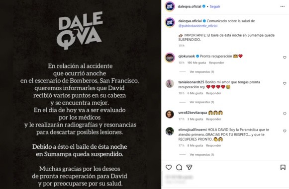 El cantante David Ortiz, uno de los vocalistas de la banda de cuarteto Dale Q’ Va, sufrió un fuerte golpe que le provocó una herida en la cabeza, luego de que se desfondara parte del escenario durante un recital. El artista se encuentra fuera de peligro.