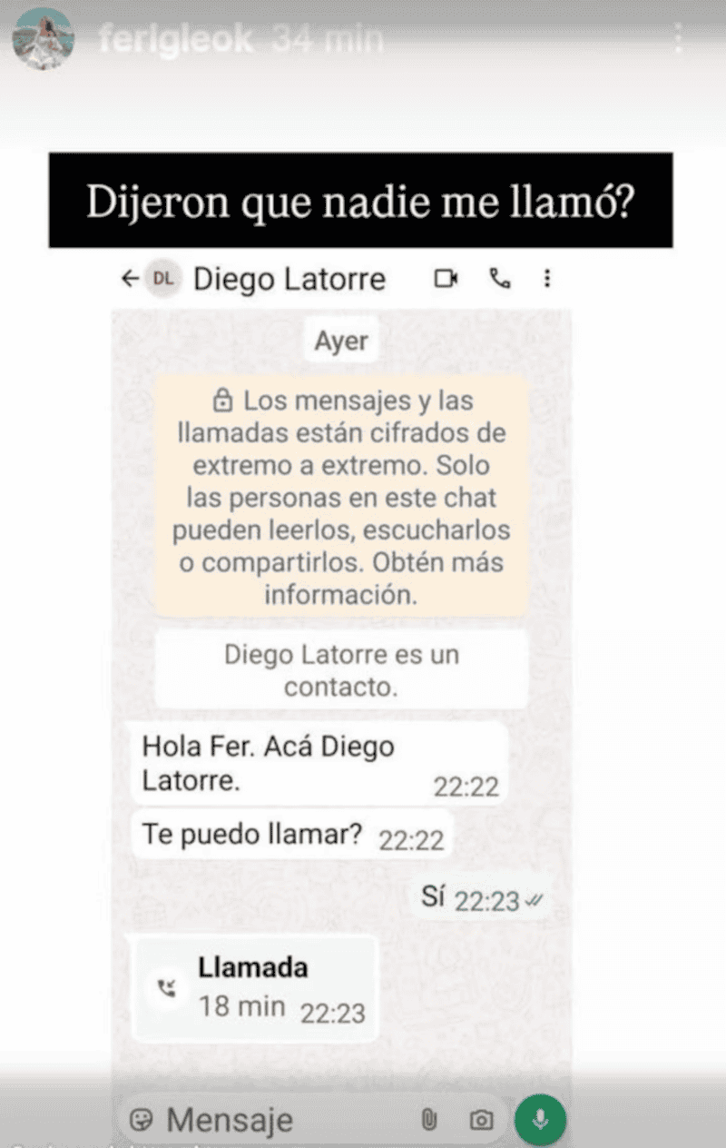 Además, en su cuenta de Intagram, también siguió con el tema y mostró una captura de pantalla de una conversación que mantuvo con Diego. Él le escribió, se presentó y le preguntó si la podía llamar.