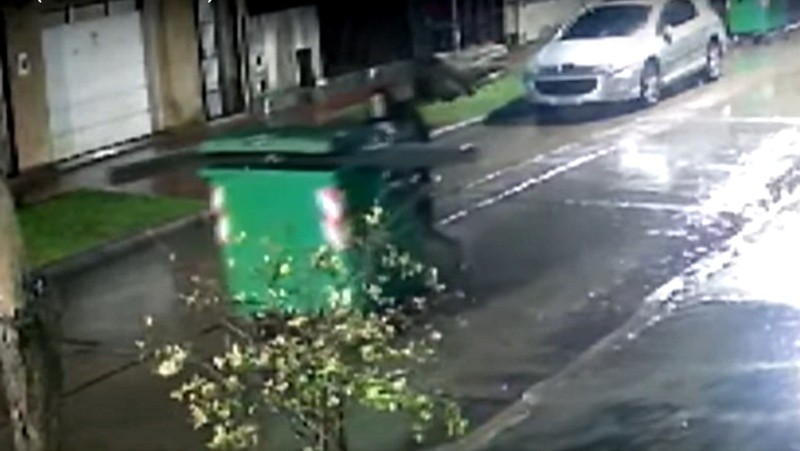 Un joven fue captado por cámaras de videovigilancia mientras arrastraba un contenedor de basura en la zona norte de Rosario. De acuerdo a lo que denunciaron vecinos del lugar, utilizó el volquete plástico para guardar y trasladar objetos robados. El video lo muestra en plena tarea bajo la lluvia torrencial de este miércoles a la noche.
