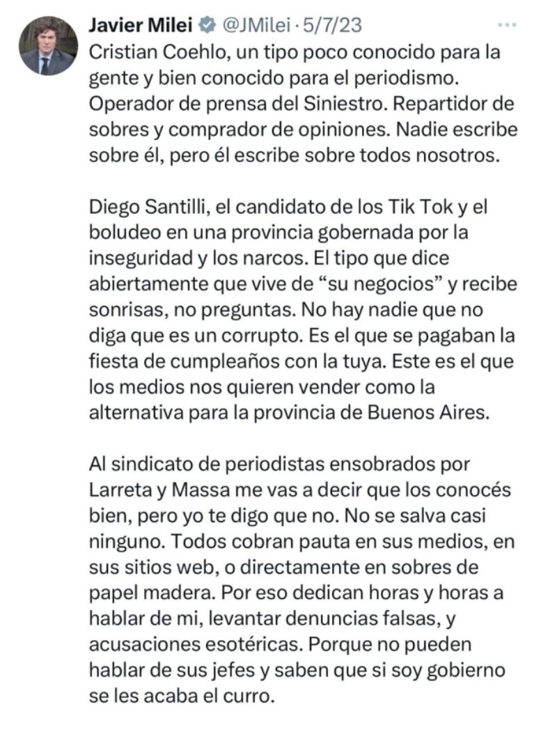 “Diego Santilli, el candidato de los TikTok y el boludeo en una provincia gobernada por la inseguridad y los narcos. El tipo que dice abiertamente que vive de “su negocio” y recibe sonrisas, no preguntas. No hay nadie que diga que no es un corrupto. Es el que pagaban la fiesta de cumpleaños con la tuya. Este es el que los medios nos quiere vender como la alternativa para la provincia de Buenos Aires”, despotricó Milei contra el dirigente pelirrojo.