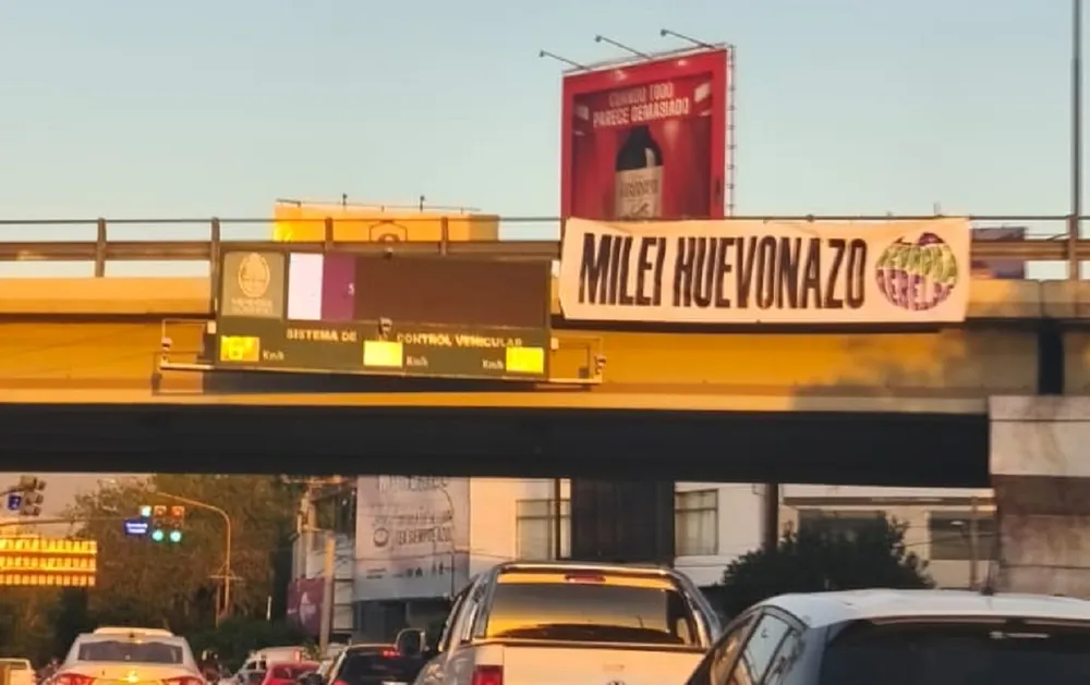 Organizaciones gremiales, familias de personas con discapacidad y jubilados de Mendoza realizaron este jueves una movilización en la ciudad de San Rafael en repudio a la visita del presidente Javier Milei. En ese marco, el puente que conecta el Acceso Este y la Avenida Vicente Zapata, que amaneció con un enorme cartel con la consigna "Milei huevonazo".
