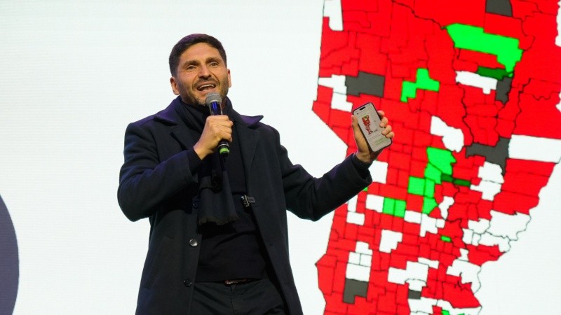 La mejor noticia para Unidos no está en Rosario y eso se interpretó con la aparición del gobernador Pullaro junto a la vice Gisela Scaglia. Fueron los primeros en salir a hablar públicamente, apoyados por la leyenda “tremendo triunfo provincial” en la pantalla del escenario. El jefe de la Casa Gris mostró un mapa de la bota pintada con distintos colores, según qué fuerza ganó en los comicios. “Adivinen quién es el rojo”, arenga a los presentes.