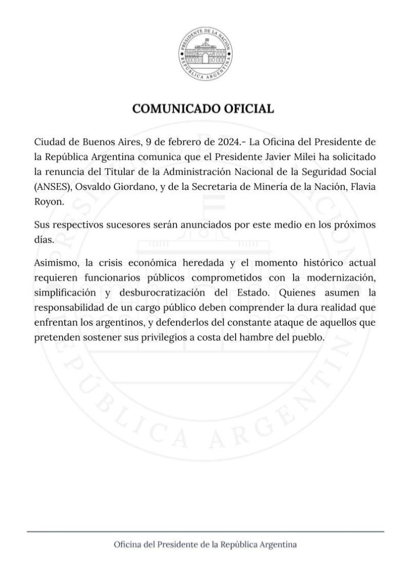 El presidente Javier Milei pidió las renuncias del titular de Anses, Osvaldo Giordano, y de la secretaria de Minería, Flavia Royón, según precisó un comunicado publicado este viernes por la Oficina del Presidente en redes sociales.