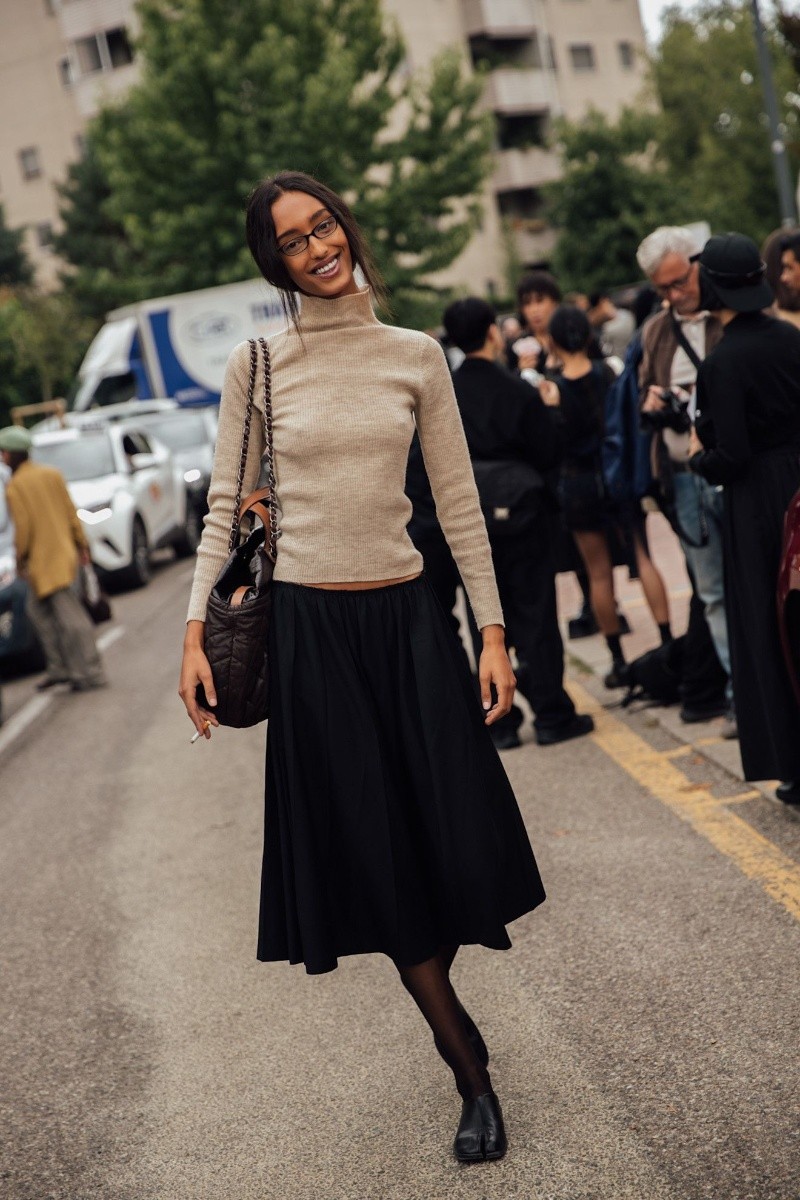 Se trata de una combinación clásica que nunca falla. Un sweater de cuello alto en lana fina junto a una falda negra en corte “A”, ofrecen en conjunto un look sobrio y elegante, ideal para jornadas laborales o encuentros formales. La falda acampanada aporta movimiento y feminidad, mientras que el sweater de cuello alto brinda calidez y sofisticación.