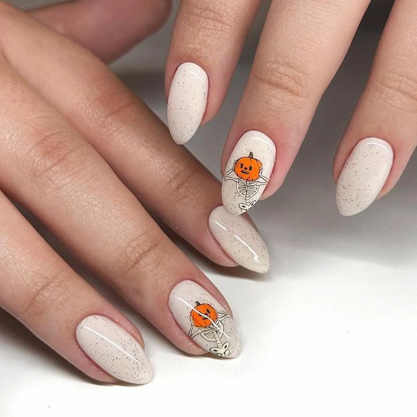 -Pumpkin nails en versión minimalista: Si se busca algo más tierno que aterrador, las calabazas siguen en el podio. Se llevan sobre bases nude, blancas o transparentes con pequeños dibujos (quizás no en todas las uñas). Aportan color y un aire cálido que combina con cualquier outfit.
