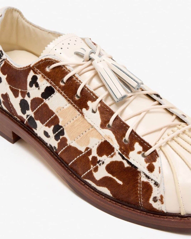 En esta nueva versión, los Superstar están cubiertos por completo con un estampado de vaca en pony hair, un recurso que transforma por completo la lectura visual del clásico modelo. Los tradicionales cordones planos se reemplazan por unos encerados, y una pequeña borla en la lengüeta añade un guiño inesperado al mundo del calzado tipo mocasín. Además, la icónica Shelltoe ya no es de goma, sino que ahora está hecha de piel, subrayando el enfoque híbrido y elegante de este diseño.