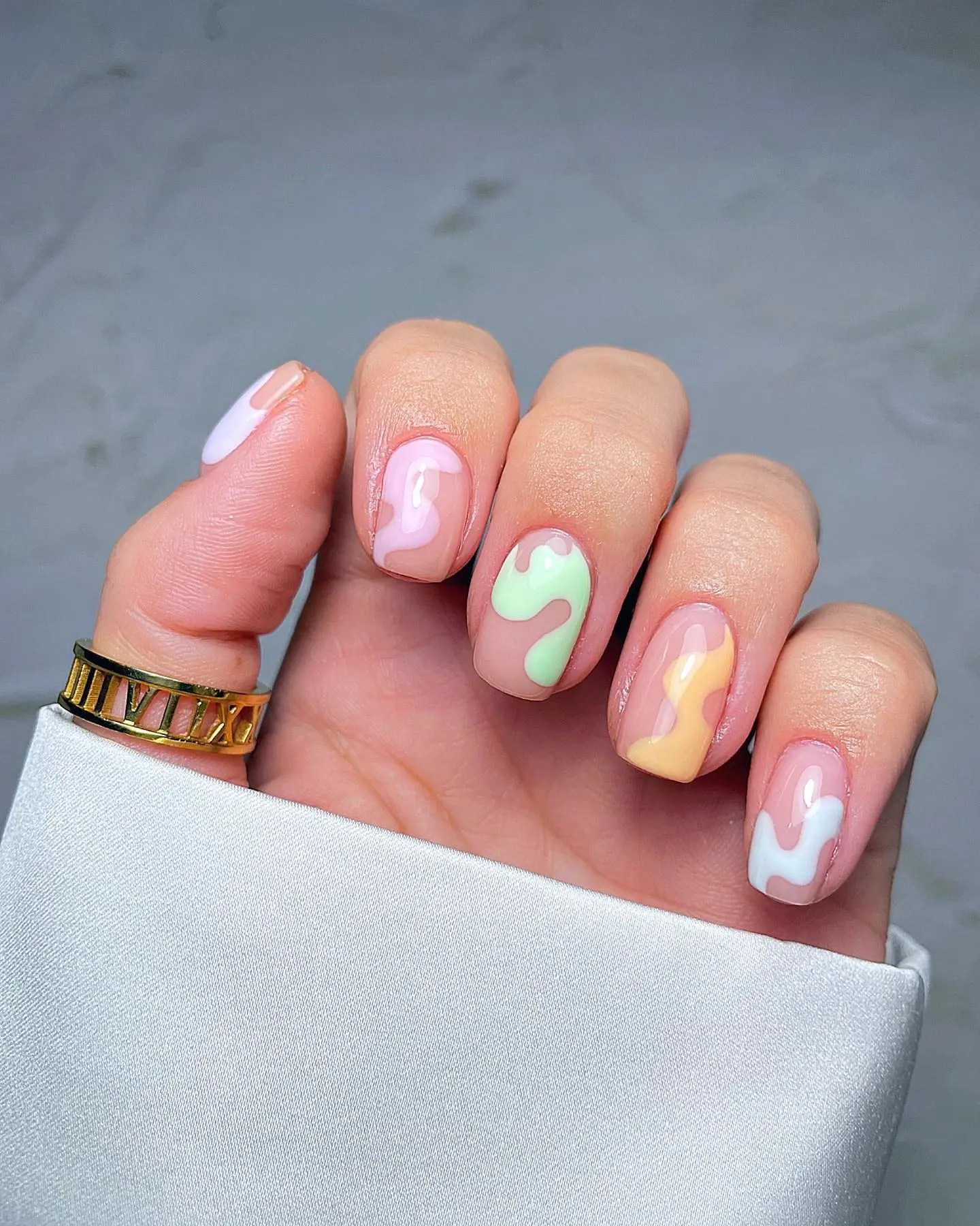 -Tonos suaves con detalles gráficos: Rosados, nude, durazno o lavanda se combinan con ondas, estrellas minimalistas o trazos abstractos, logrando un look fresco y moderno ideal para una noche larga de brindis y festejos.