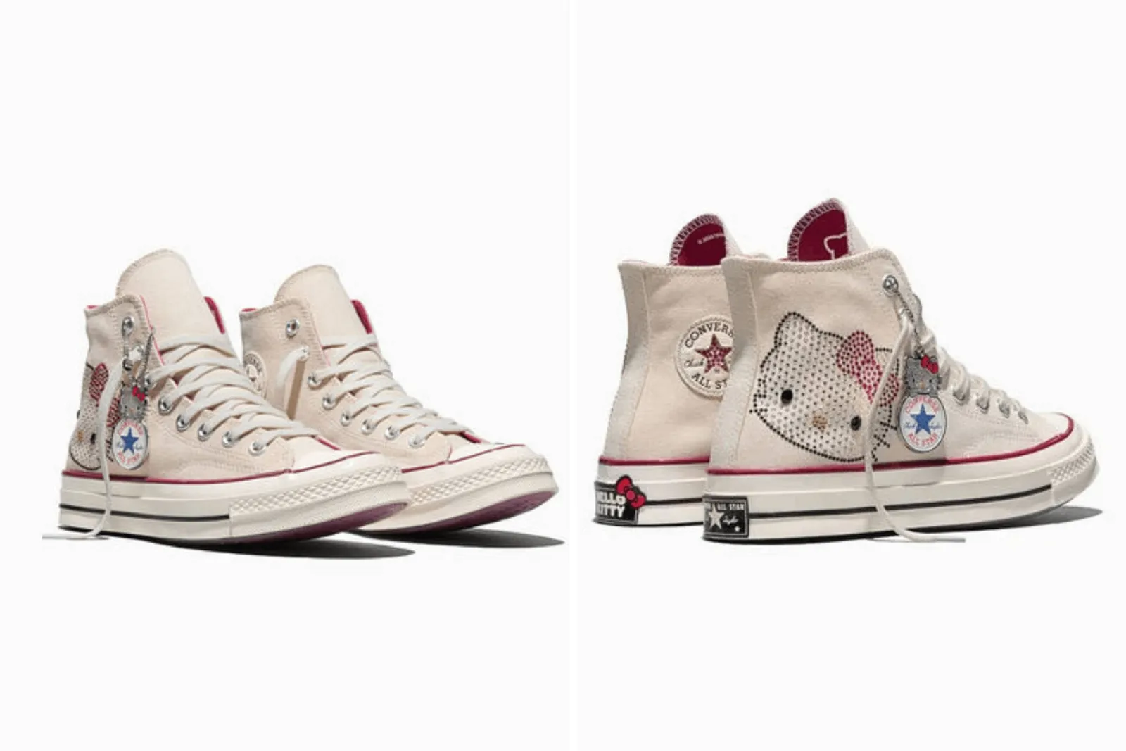 En cuanto a los detalles, las zapatillas presentan gráficos y guiños al universo del personaje, además de un colgante desmontable que combina el logotipo de All Star con un pequeño colgante de Hello Kitty adornado con cristales. También incluyen extras como cordones adicionales y accesorios coleccionables, elementos que refuerzan su carácter de edición especial.